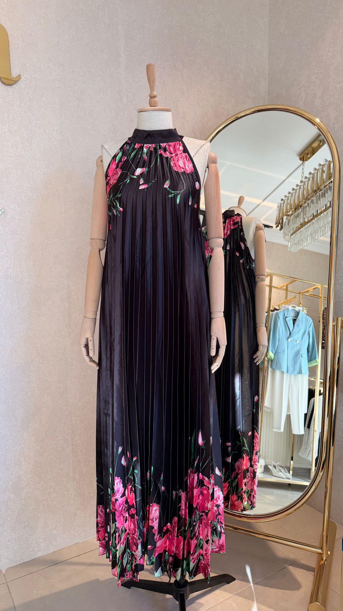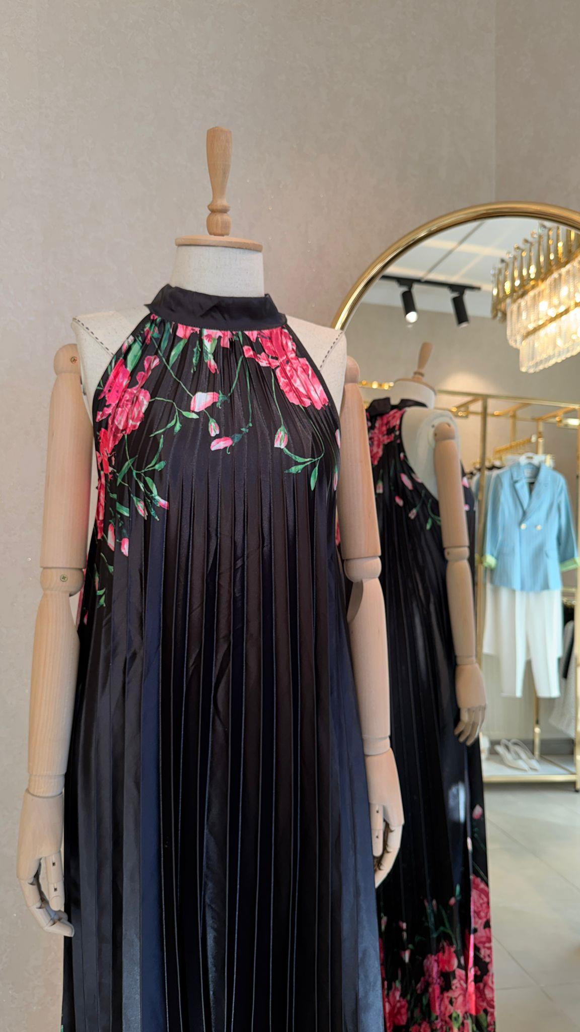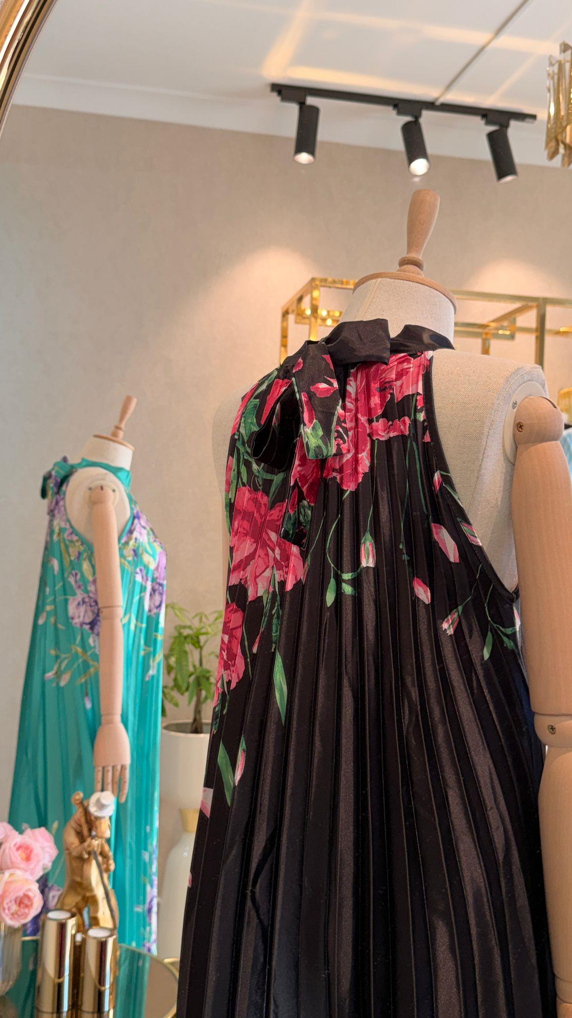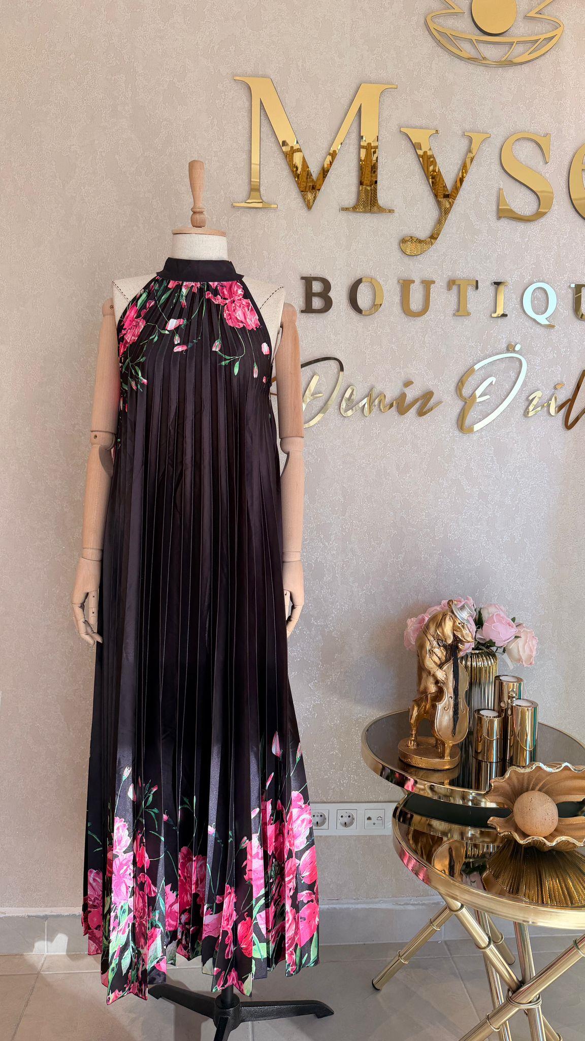 BOYUNDAN BAĞLAMALI ÇİÇEK DESENLİ ELBİSE SİYAH
