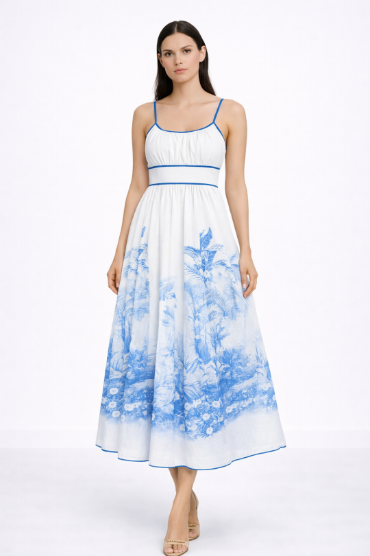 MAVİ BASKILI OMUZDAN BAĞLAMALI ELBİSE MAVİ
