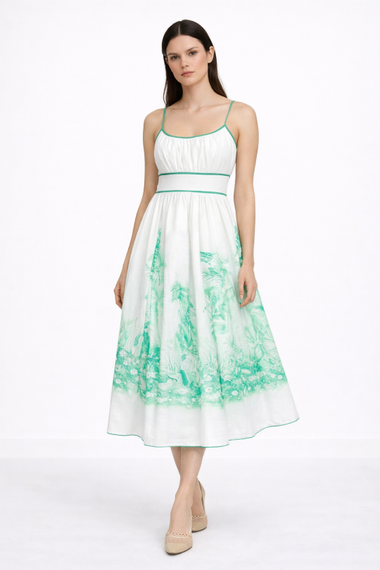 YEŞİL BASKILI OMUZDAN BAĞLAMALI ELBİSE YEŞİL