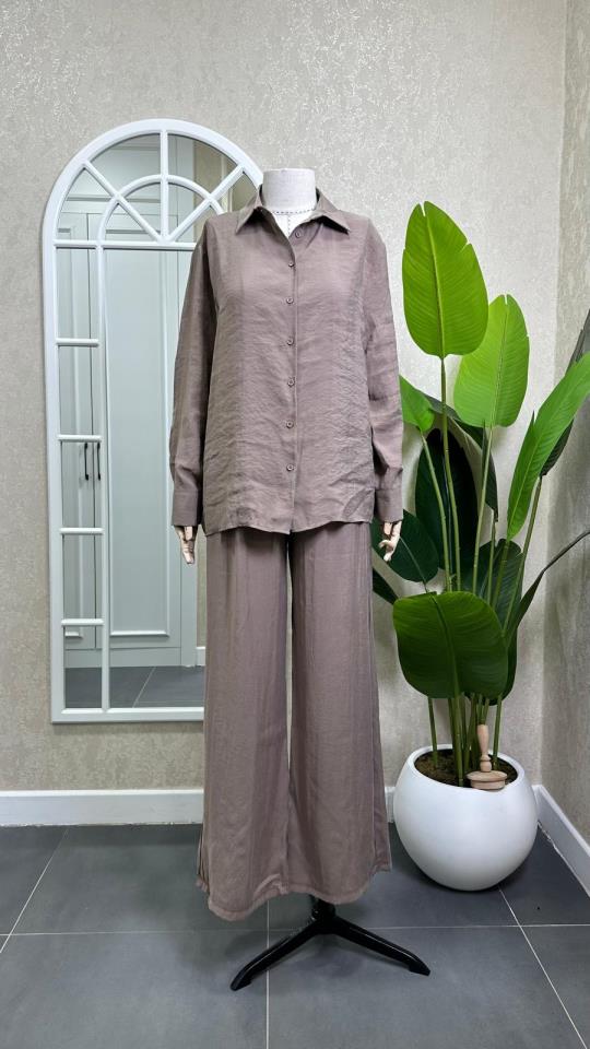 BELİ LASTİKLİ GÖMLEK PANTOLON TAKIM KAHVE