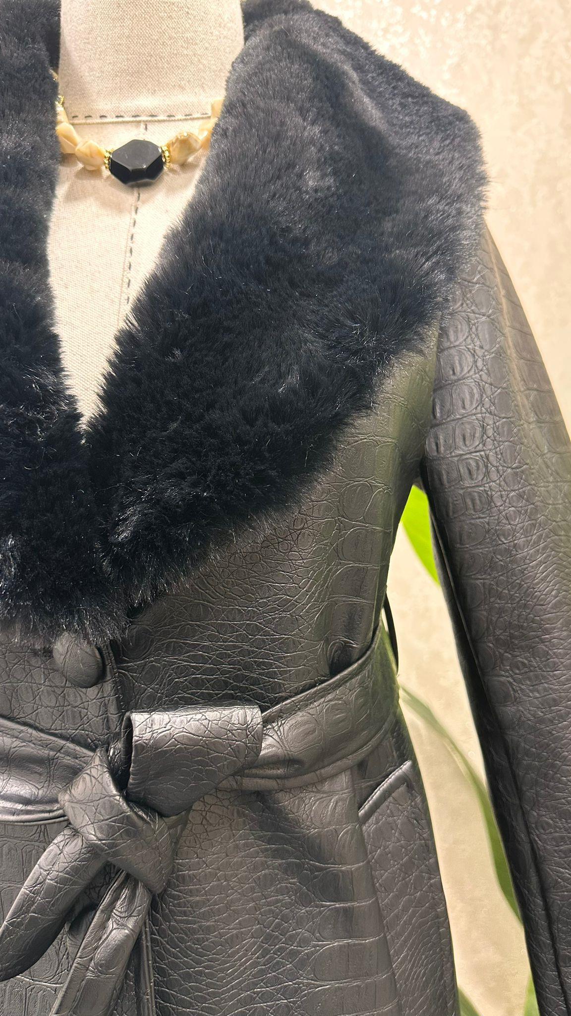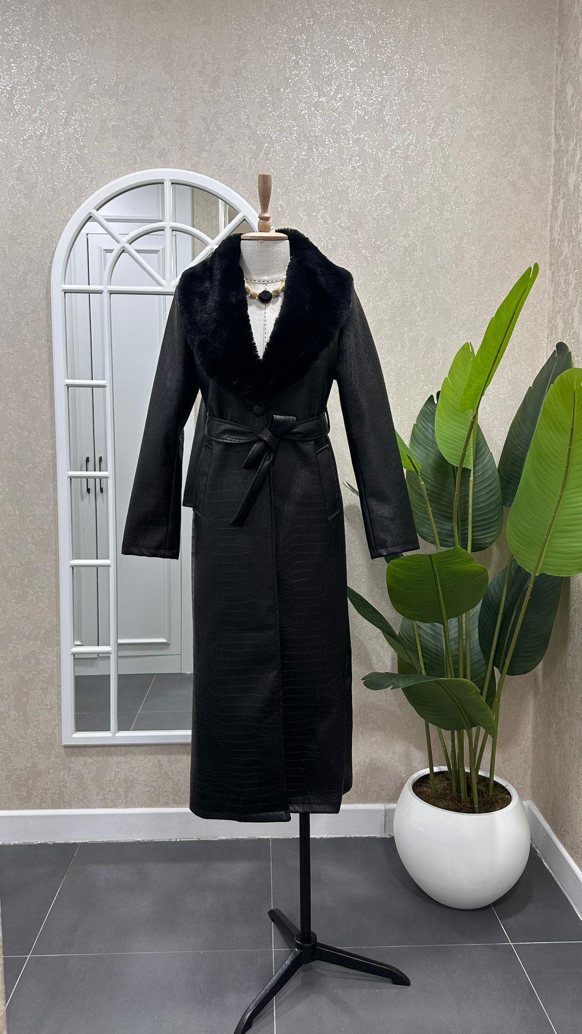 TİMSAH DESEN YAKASI KÜRKLÜ DERİ KABAN SİYAH